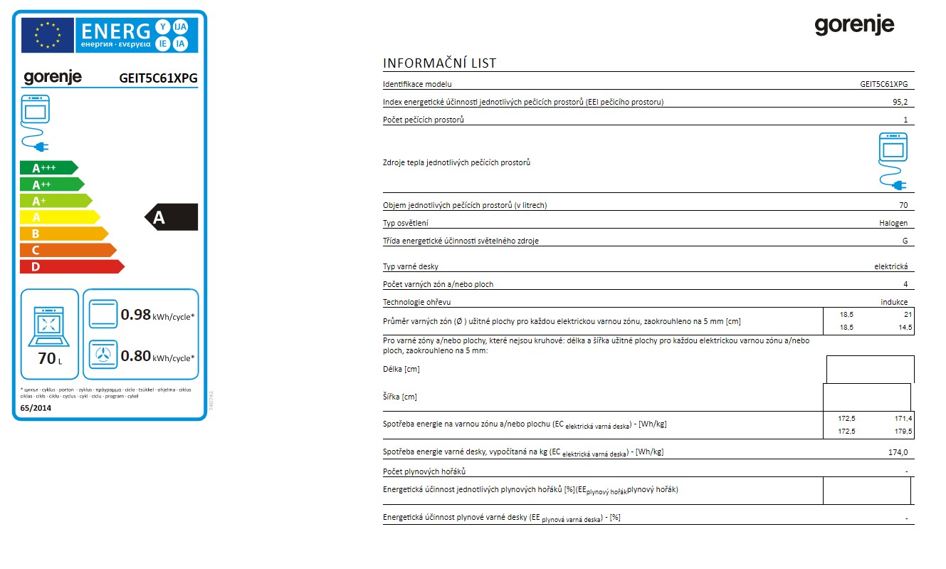 kombinovaný sporák • energetická trieda A • objem 74 l • horný a spodný ohrev • Eco Clean čistenie rúry • bezpečnostné prvky: Stop Gas, detský zámok, chladné dvierka • príslušenstvo: rošt, XXL hlboký pekáč • V × Š × H: 85 × 50 × 59,4 cm